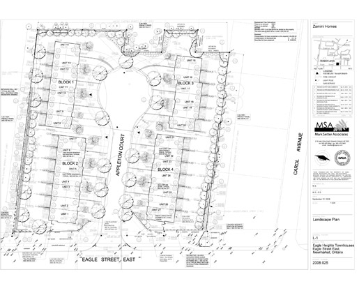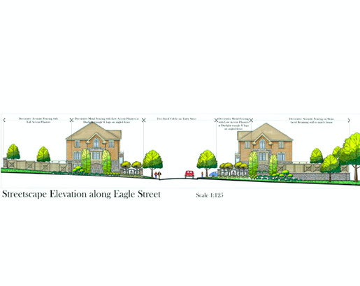 The Eagle Street Townhouses are an infill project in the town of Newmarket. Existing homes flanking the site on both sides required sensitive treatment to ensure existing trees and shrubs surrounding the existing homes were maintained. New plantings and fencing were proposed to ensure privacy for the existing neighbourhood while providing beautiful backyards for the new homes . Decorative acoustic fencing on top of a stone-faced wall with feature plantings, metal fencing and matching pilasters at the entrance highlight and soften the project along the Eagle Street frontage.