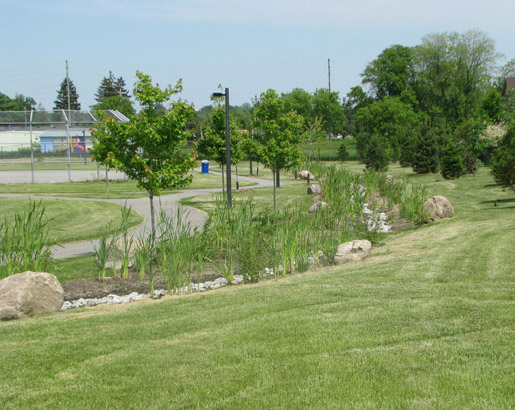 Gentle bio-swales with native plantings encourage slow percolation of rainwater, provide habitat for bird and butterflies and help promote eco-friendly green ideals. Simple urban design details throughout the community have been brought into the park at all entrances helping to tie the park into the fabric of the neighbourhood.