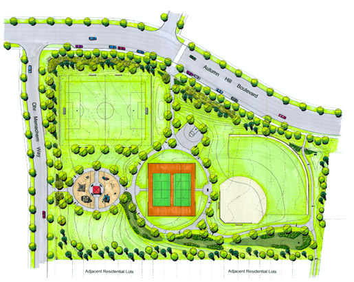 The park provides for active recreation such as baseball, basketball, soccer and tennis while maintaining spaces for more passive activities such as leisurely strolls. Seating areas for social gatherings and a decorative gazebo provide a shady spot for watching the children enjoy the playground areas.